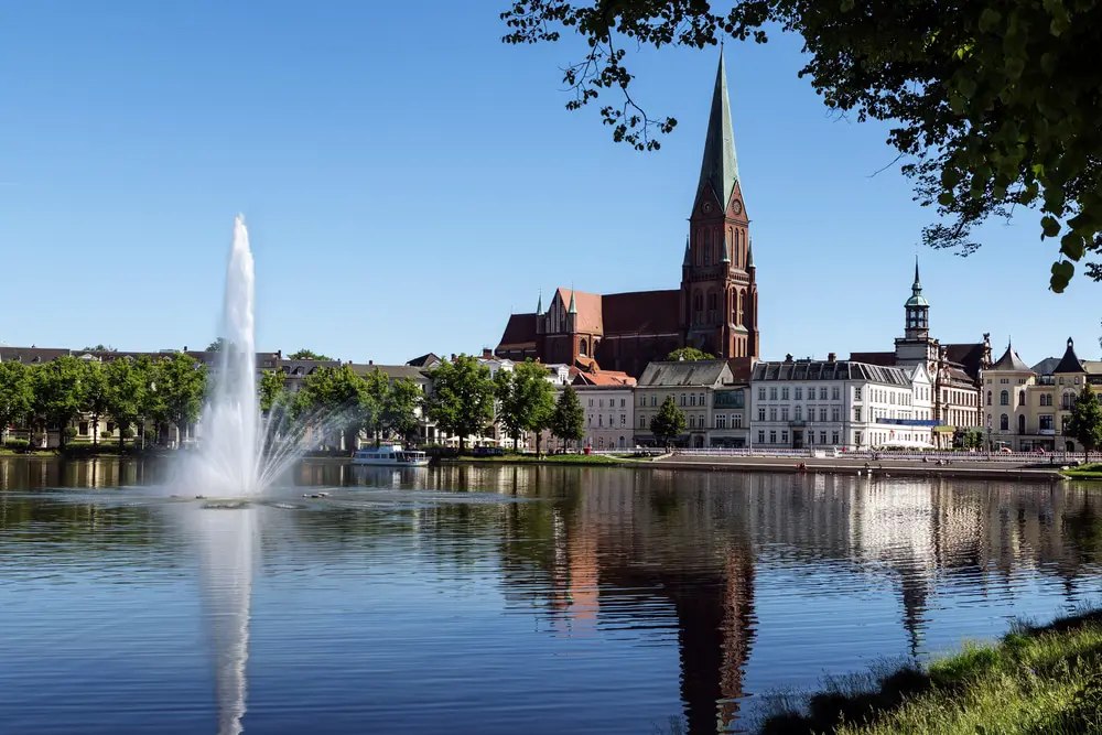 Parecido a un castillo del Valle del Loira, el palacio se encuentra en una isla propia, unida por un puente a un jardín barroco con monumentos reales, esculturas de arenisca y dividido por un canal transversal al estilo de Versalles. Schwerin es una ciudad de agua, con 12 lagos diferentes en sus límites. El más bonito de ellos es el Pfaffenteich, enmarcado por grandes edificios de apartamentos del siglo XIX, mientras que en verano es imprescindible hacer una excursión en barco por el Schweriner See.
