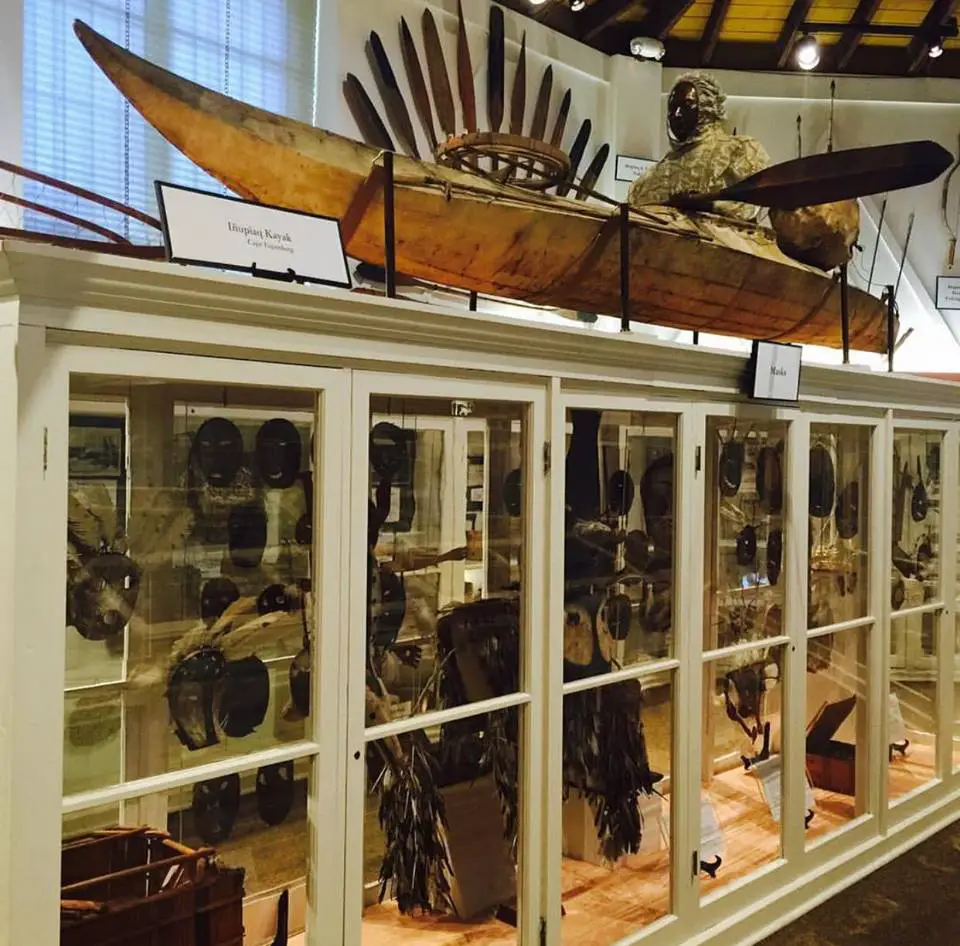 Destacan una canoa y las tallas de argilita negra que forman parte de la colección de material de los indios de la costa noroeste de Alaska.