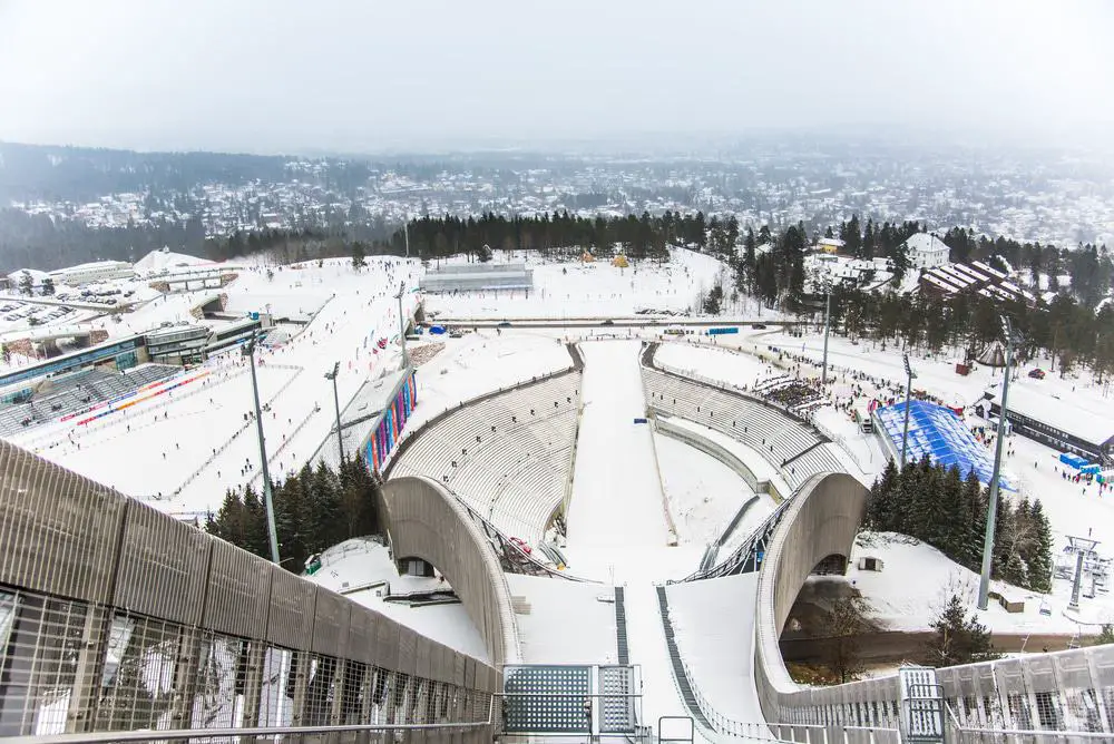 Una hermosa gama de colinas boscosas al noroeste de Oslo esconde las áreas de esquí más populares de Noruega, y es el hogar del enorme salto de esquí Holmenkollen.