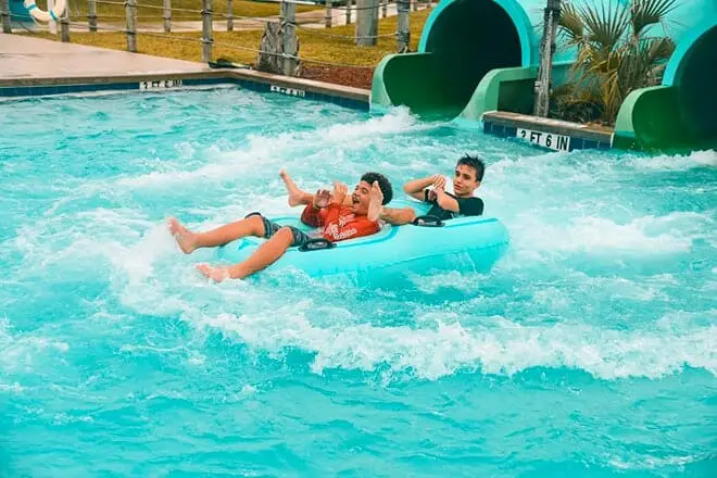 Para una inyección de adrenalina, experimente el X-celerator, un tobogán extremo que le permite viajar a 30 millas por hora. Asimismo, puede disfrutar de las otras atracciones dentro del parque, que incluyen chapoteaderos, una piscina familiar, canchas de voleibol y un río lento.