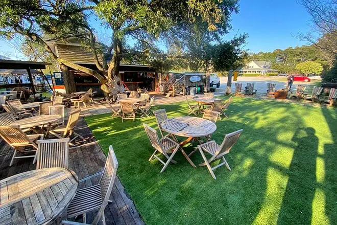 Disfrute de una de las mejores cosas para hacer en Corolla, NC, con sus amigos o alguien especial, poniéndose al día en esta tranquila cafetería y cervecería al aire libre.