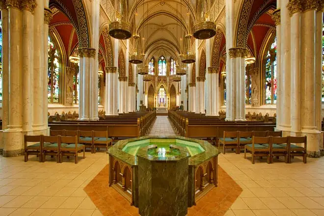 Como si la hierba verde bien cuidada y la belleza del edificio exterior no fueran motivo suficiente para visitarla, te sorprenderá la vasta colección de vidrieras de la catedral.