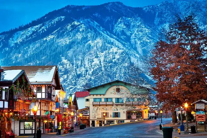 Leavenworth es un pequeño pueblo alpino/bávaro del viejo mundo con un hermoso diseño y una reputación de ser el "pueblo navideño de Estados Unidos".