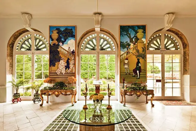 Recorra la mansión y vea sus detalles palaciegos, incluida la gran escalera, el trabajo en madera tallada, los candelabros y los murales del techo. Y asegúrese de pasar por su extravagante salón de baile.