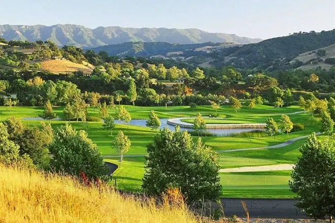 El campo del río Alisal es un campo de golf de primer nivel y presenta un paisaje impresionantemente hermoso, con vistas a la montaña, exuberante vegetación, árboles color esmeralda y aguas resplandecientes.