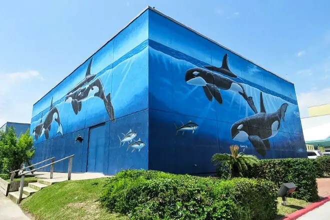 Otra instalación única que a los amantes del arte les encantará visitar en la isla es este mural de tres paredes que representa ballenas nadando. Este es el mural número 53 de Robert Wyland y el único en Texas.