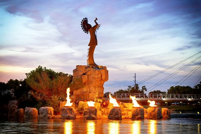 The Keeper of the Plains exhibe una escultura de acero Corten de 44 pies de altura, que se encuentra en el punto donde se unen los ríos Big y Little Arkansas en el centro de Wichita.