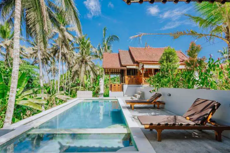 This magical treehouse is one of the most popular Airbnbs in Bali for a reason. In addition to a dual-level swimming pool that overlooks the picture-perfect rice fields, it has a bistro table next to a large living tree, which is growing from the floor and cuts through the roof. Climb the stairs around a second tree to reach the upper level, which has a private balcony and swing chair that will make you feel as if you’re in the treetops.