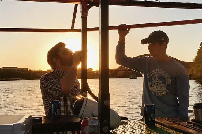 Lake Travis rebosa de energía juvenil cuando sale el sol. Esto se calma cuando se pone el sol, creando el telón de fondo romántico perfecto para un crucero al atardecer en un lujoso barco de dos pisos. Si hace buen tiempo, ¡el barco puede detenerse un poco para que nades!