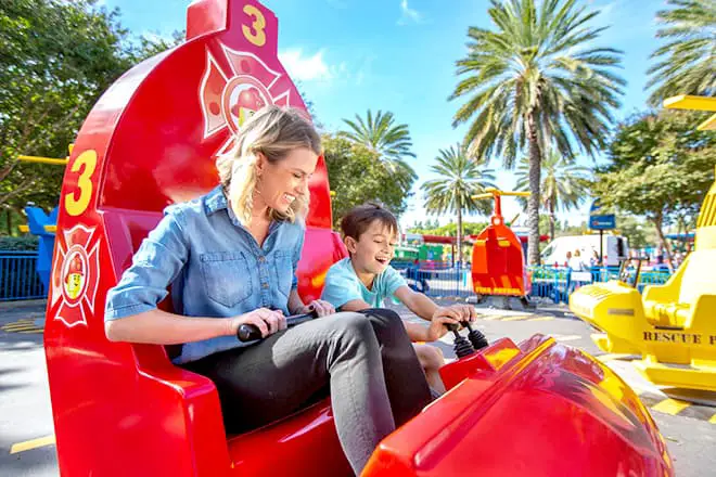 Y no, no se trata solo de niños. También está el paseo de Rescate de la Academia de Policía y Bomberos para mamá y papá. Todos pueden subirse a uno de estos camiones y mover las palancas mientras compiten entre sí para apagar el fuego o detener un robo.