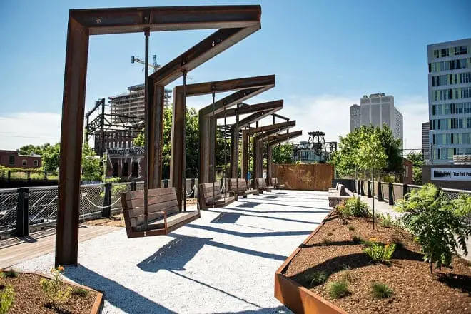 El Rail Park es encantador y único y ofrece impresionantes vistas de la ciudad. Tiene bancos columpios donde puede balancearse mientras lee un buen libro, escucha música o toma el aire fresco. También cuenta con una exuberante vegetación y caminos llanos y pavimentados perfectos para dar un paseo.