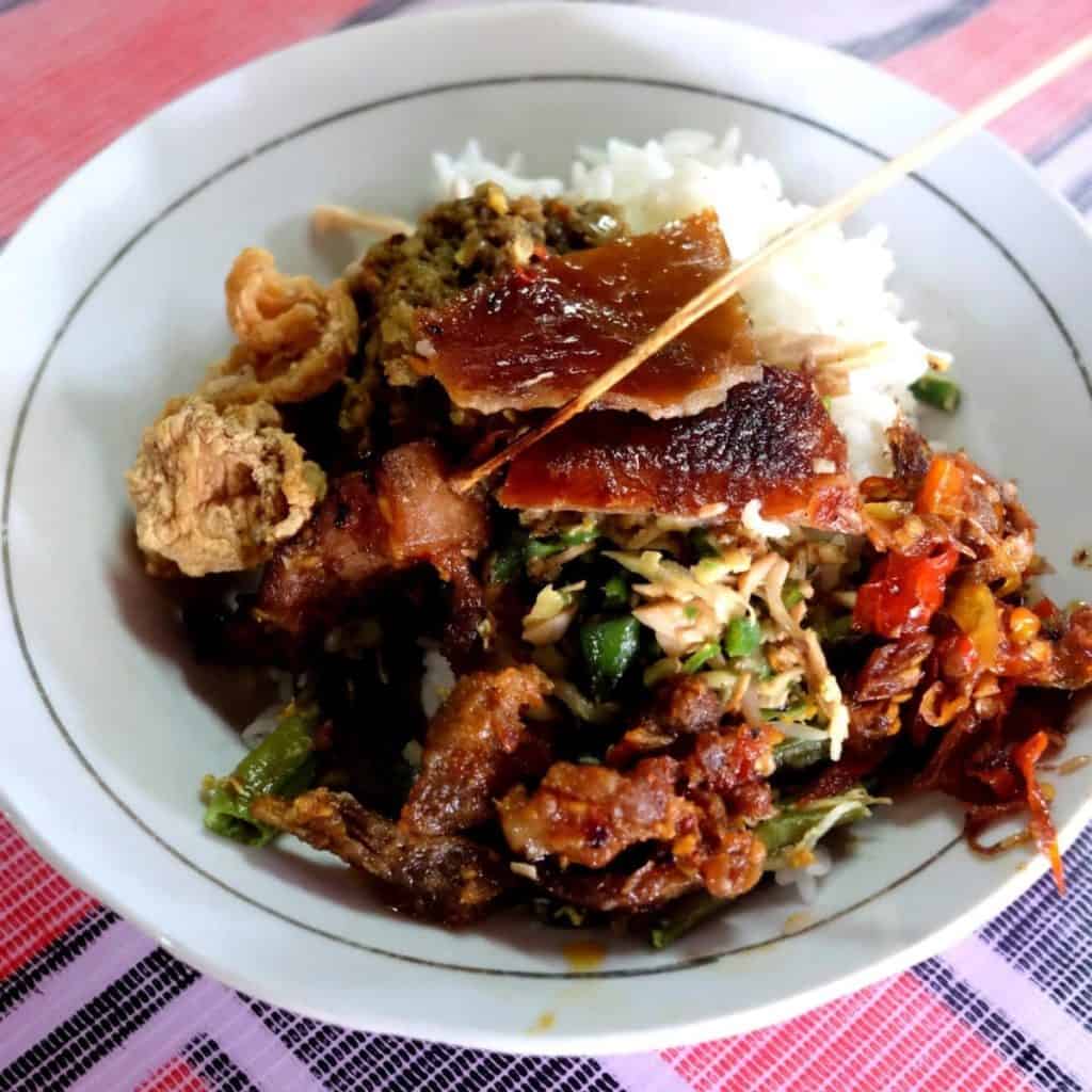 Uno de los lugares más famosos para probarlo en Nusa Dua es Warung Dobiel, donde también puede obtener otros platos de cerdo como sopa de cerdo y guarniciones como el curry de jaca.