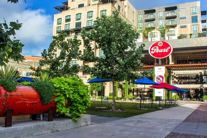 Al fondo, al norte del centro de San Antonio, se alza el majestuoso Hotel Emma , que anteriormente fue el complejo cervecero titular desde 1883.