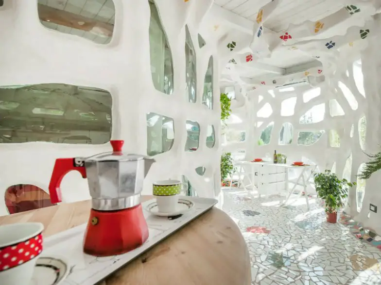Promocionada como una escultura habitable, la casa tiene paredes de coral con mosaicos incrustados: es intrigantemente impresionante y el sueño de un amante del arte. Una pequeña cocina, baño luminoso y exuberantes jardines son accesibles para los huéspedes. El anfitrión deja golosinas de cortesía como bebidas en la pequeña nevera mientras brinda mucha privacidad. El centro de la ciudad está a poca distancia en coche.