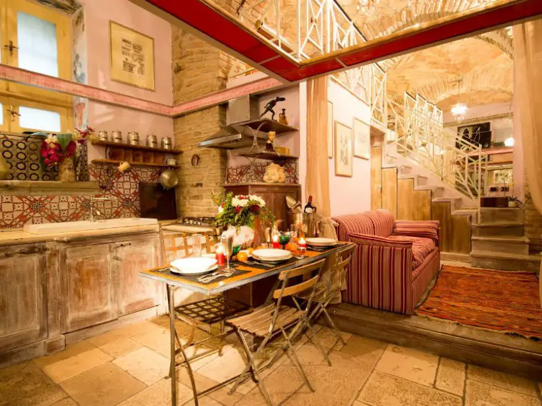 Los detalles auténticos tienen esta casa a punto de estallar: mires donde mires hay otro detalle profundamente pensado, desde techos de ladrillo arqueados, candelabros coloridos, mármol tallado a mano, varios azulejos y fuentes y decoración centenarias. La morada fue rediseñada con “la filosofía de la recuperación de materiales antiguos”, por lo que quedarse aquí es como una búsqueda del tesoro, una lección histórica y unas vacaciones, todo en uno. Relájese en la veranda, use ollas romanas y las propias recetas del anfitrión para preparar una comida, o recorra los restaurantes cercanos. El Coliseo no es más que un corto paseo de distancia.