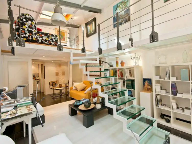 Si bien este apartamento tipo loft parece muy moderno con sus escaleras de vidrio, una pasarela transparente y una decoración vanguardista, el tema va mucho más allá de la superficie. Una vez que el estudio de pintura del artista italiano Italo Scelza, la propiedad es una oda a su trabajo y a la creatividad en general. La arquitectura es cautivadora, y cuatro invitados pueden quedarse fácilmente dentro de esta morada abierta e imaginativa.