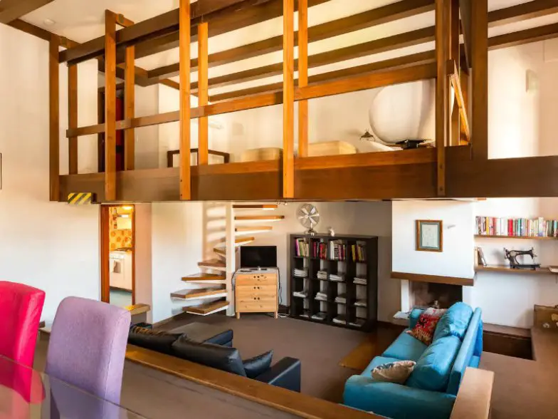 En primer lugar, el apartamento está exactamente a 100 metros del Coliseo. Pero el interior es súper interesante, con un área de loft para dormir con plataforma de madera que se cierne sobre la sala de estar real. ¡Parece una especie de fuerte increíble, con una chimenea debajo! Las explosiones de coloridos azulejos naranjas hacen que el baño sea bastante alegre, y la cocina continúa con las mismas imágenes edificantes.