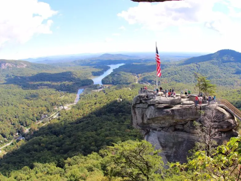 Chimney Rock, un enorme afloramiento de granito de 315 pies ubicado en el Parque Estatal Chimney Rock, ofrece vistas incomparables de Blue Ridge Mountain desde su altura de 2,280 pies sobre el nivel del mar. De hecho, desde la cima, puede disfrutar de una vista de 75 millas en todas las direcciones, incluido Hickory Nut Gorge y el cercano lago Lure. Aunque el ascenso a la cima es de dificultad intermedia, es apto para niños y las vistas definitivamente hacen que el ascenso valga la pena.