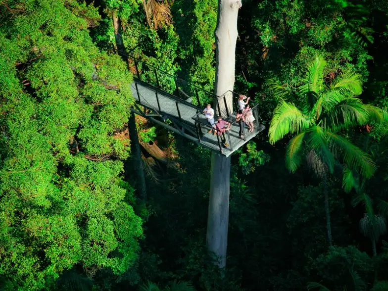Ubicado en el interior de Gold Coast, el Tamborine Rainforest Skywalk se extiende por casi una milla. En el camino, podrá disfrutar de la sorprendente belleza natural de la selva tropical, cruzar el Skywalk Bridge, el Skywalk Cantilever y llegar a la plataforma de observación Cedar Creek, todos conectados por un camino que serpentea a lo largo del dosel. La experiencia tarda solo 45 minutos en completarse a un ritmo pausado, lo que facilita la integración. Termina en el centro principal, que ofrece una cafetería y una tienda de regalos.