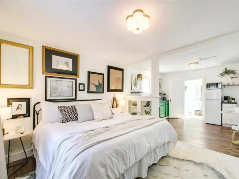 Tanta personalidad está escondida dentro de esta pequeña casa. Desde los gabinetes verdes en la cocina hasta los espacios para dormir súper cómodos, nos encantan los elementos divertidos y modernos. Se pueden encontrar muchos toques de spa en el baño, que también tiene la bañera y la pintura de pared más frescas.