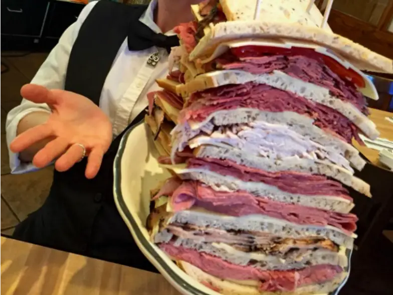 Este sándwich de $ 65 en Kenny & Ziggy's New York Delicatessen en Houston atrae mucha atención cada vez que un alma valiente lo pide. Con casi cuatro libras, este sándwich de ocho capas está repleto de seis embutidos diferentes, que incluyen pastrami, pavo, rosbif, lengua, salami y carne en conserva. El sándwich también cuenta con queso suizo, aderezo ruso y pimiento rojo dulce. Ahora bien, este desafío de comida no tiene límite de tiempo, pero debes completar este monstruo tú solo para ganar el premio, que es una rebanada de pastel de queso casero.