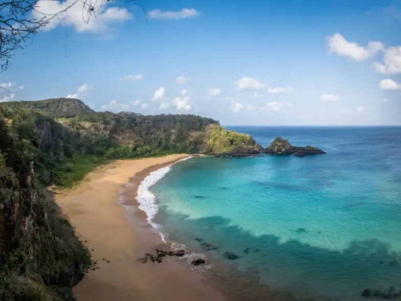 El Parque Nacional Marino Fernando de Noronha es un parque marino que se compone de varias islas en el océano y a lo largo de la costa de Brasil. Hay seis islas que forman parte de este archipiélago, pero muchas personas solo pasan tiempo en la isla principal. Ven al Parque Nacional Marino Fernando de Noronha para practicar natación, esnórquel y surf. Las aguas cristalinas también son ideales para el buceo. Esta es una hermosa zona de playa de Brasil que alberga muchos tipos de peces y vida silvestre marina, como las tortugas. El número de visitantes aquí es limitado por día para ayudar a conservar el medio ambiente.