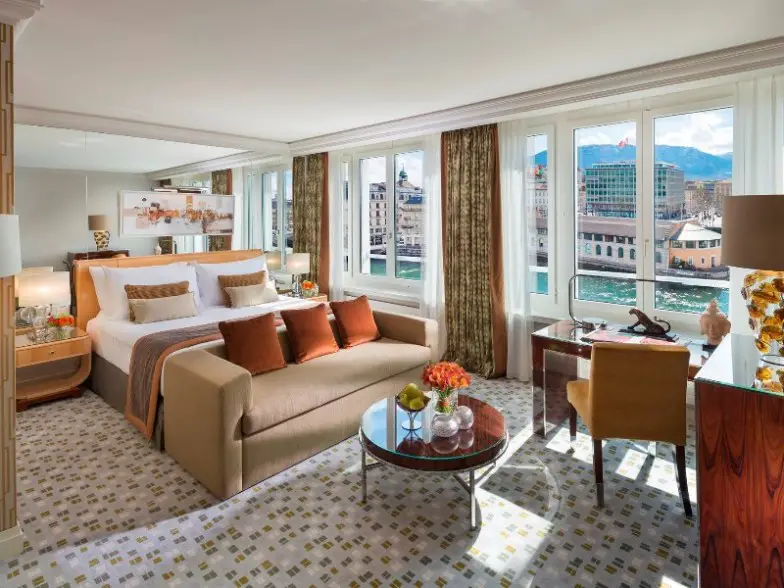 Otro hotel cinco estrellas de lujo en Ginebra es el Mandarin Oriental. Este hotel ofrece un entorno tranquilo con vistas a la montaña y al río y también mucho encanto suizo. Hay 189 habitaciones y suites aquí que son elegantes y están elegantemente decoradas. Para las opciones gastronómicas, los huéspedes pueden elegir entre Rasoi by Vineet para la cocina gastronómica india, Café Calla para comidas modernas durante todo el día, Le Chalet para platos alpinos tradicionales y el bar MO para comidas ligeras durante todo el día. También hay un gimnasio abierto las 24 horas, un estudio de belleza y servicios de peluquería en este retiro urbano.