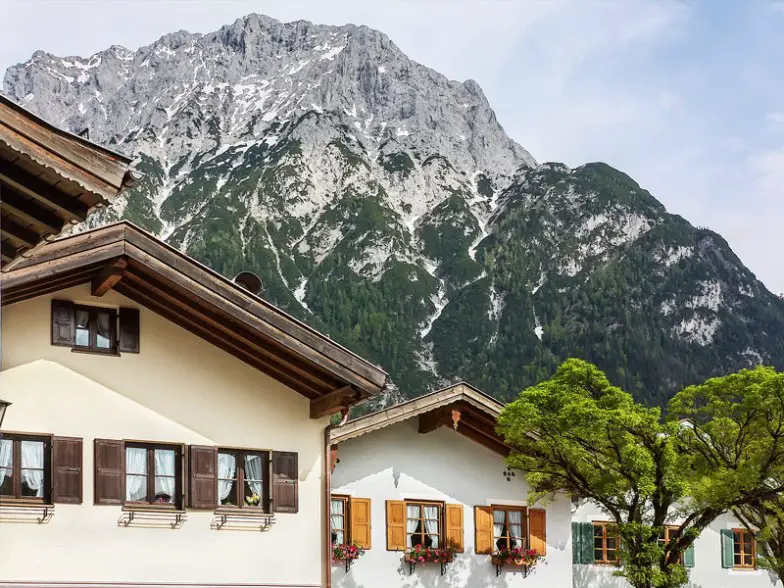 Esta encantadora ciudad turística de montaña bávara que se encuentra a menos de 90 minutos en tren desde Múnich fue una vez dos ciudades separadas, una romana y otra teutónica. Los Juegos Olímpicos de Invierno de 1936 los obligaron a combinarse, aunque los dos lados todavía tienen personalidades distintas. Partenkirchen data del año 15 d. C. y está lleno de calles estrechas y empedradas que están bordeadas por edificios históricos de estilo gasthaus bávaro: tres o cuatro pisos, persianas abiertas y fachadas pintadas con imágenes en colores pastel o escenas pastorales, regionales y religiosas.