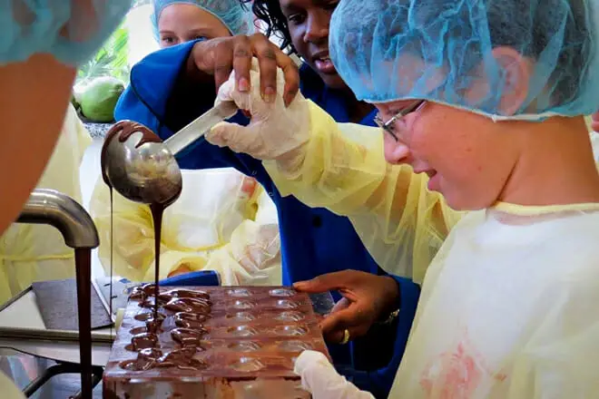 El maestro chocolatero de la fábrica te enseñará a través de una actividad divertida y práctica, o también puedes disfrutar de un recorrido por la fábrica y escuchar historias sobre la historia del chocolate y los piratas en las Bahamas.