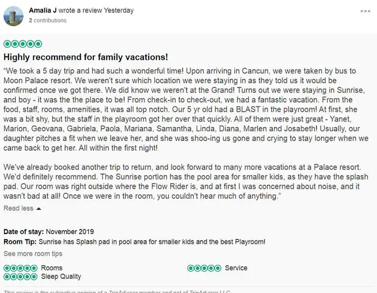 Para los veinteañeros que quieran disfrutar de la playa y relajarse en el hotel, recomiendo Beach Palace por su arena suave, olas aptas para nadar y un ambiente de resort más tranquilo. La playa de Moon Palace a menudo está cubierta de algas y los huéspedes se han quejado del olor. Con el parque acuático, los clubes infantiles y el complejo de tres propiedades, Moon Palace puede tener una sensación de mega-resort para aquellos que buscan serenidad.