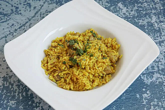 Es un plato colorido de arroz, frijoles y carne guisada.