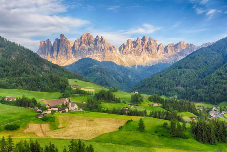 Una de las mejores opciones entre los recién casados, Val di Funes se encuentra entre Alta Pusteria y Val Garden, y se extiende hasta la cordillera de Odle que, bajo diversas luces, se transforma en tonos de naranja y rosa según la hora del día. Uno de los lugares escénicos más asombrosos del norte de Italia, los contrastes de las colinas esmeralda contra los picos de las montañas irregulares son absolutamente impresionantes. Hay muchas rutas de senderismo, desde iglesias pintorescas y desafiantes hasta iglesias pintorescas y un museo de minerales, ubicado en este pueblo.