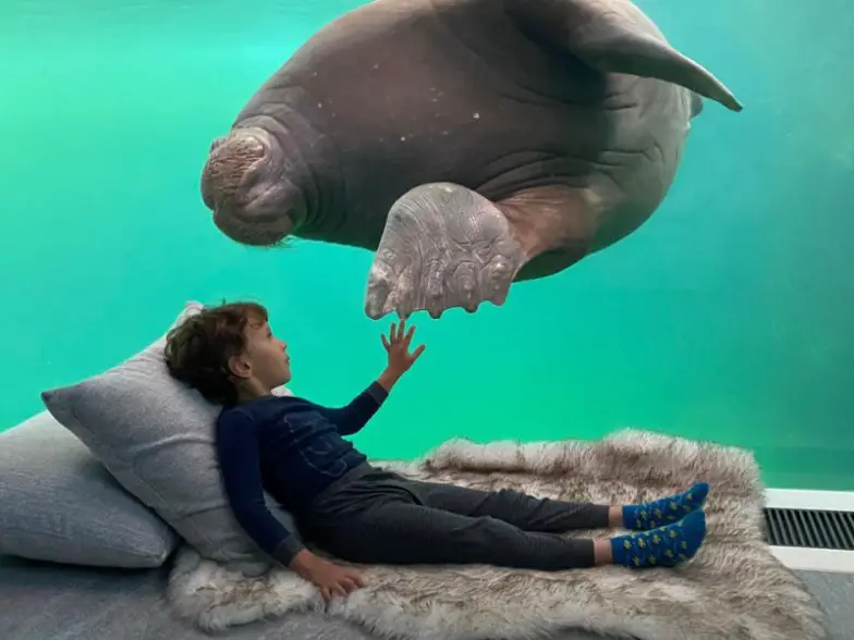 The Walrus House se encuentra dentro de la "Tierra del frío" e incluye habitaciones que se sienten como si estuvieras durmiendo en una cueva de nieve mientras disfrutas de increíbles vistas de las morsas, en su mundo submarino. Esto es lo que querrás reservar para una estancia inolvidable si no te importa la falta de privacidad, aunque no la humana. Las criaturas marinas pueden mirar directamente a la habitación a través de la pared de vidrio que la separa del tanque, proporcionando a los invitados algunos compañeros de habitación muy inusuales.