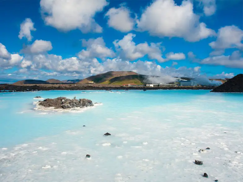 The Blue Lagoon está a solo 20 minutos en automóvil del Aeropuerto Internacional de Keflavik y a unos 45 minutos de Reykjavik , por lo que es fácil incluirlo en su itinerario. Brinda una experiencia especialmente única, con las cálidas aguas lechosas de color aguamarina rodeadas de rocas de lava negra. El agua caliente sube a la superficie, llevándose sílice, algas y otros minerales del lecho de lava a lo largo del camino, lo que proporciona su color brillante, así como sus propiedades curativas y exfoliantes. Siéntese bajo la lámina de agua que cae que golpeará sus hombros como un masaje natural, use el lodo de sílice como una máscara facial que deja su piel suave y sedosa, y nade hasta el bar en el medio para tomar una cerveza, champán de fresa o un batido verde.