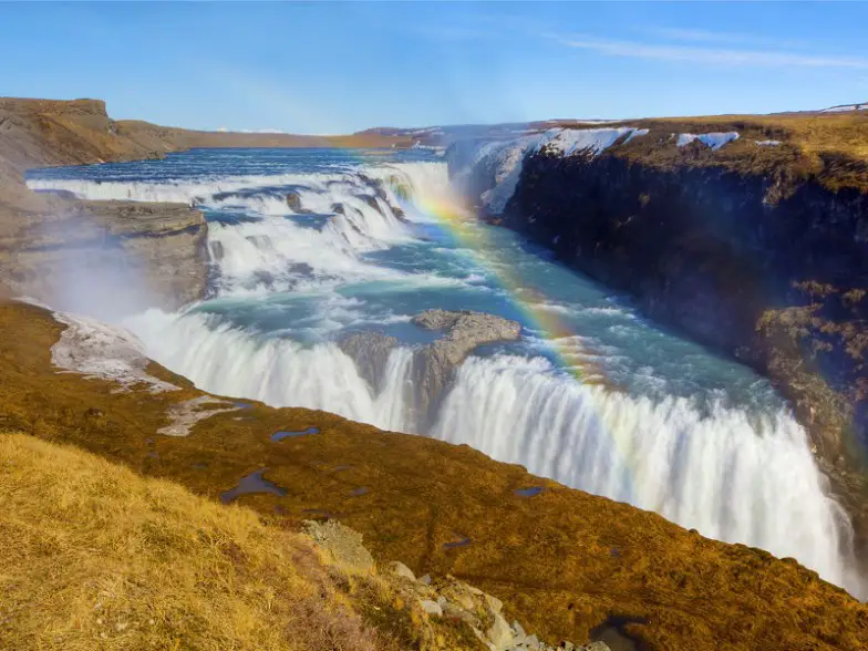Gullfoss se encuentra a lo largo de la famosa ruta turística del Círculo Dorado, aproximadamente a una hora y 40 minutos de Reykjavik. A menudo llamada la versión propia de Islandia de las Cataratas del Niágara, hay múltiples senderos para ver, uno que le permite pararse sobre él y otro que lo lleva de cerca. Cae en cascada en dos escalones, uno de 36 pies de altura y el otro de 72 pies de altura, derramándose en un cañón de más de una milla de largo debajo. El sitio incluye una amplia tienda de regalos que vale la pena al menos explorar, así como una cafetería.