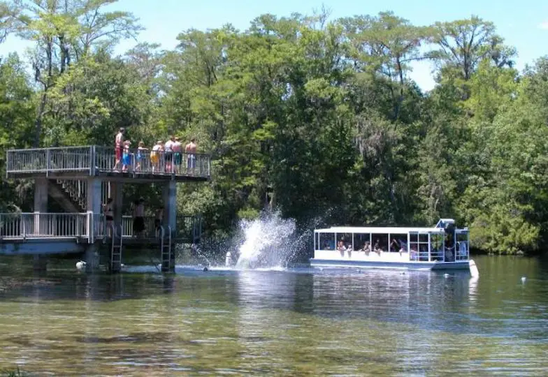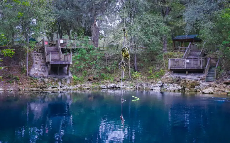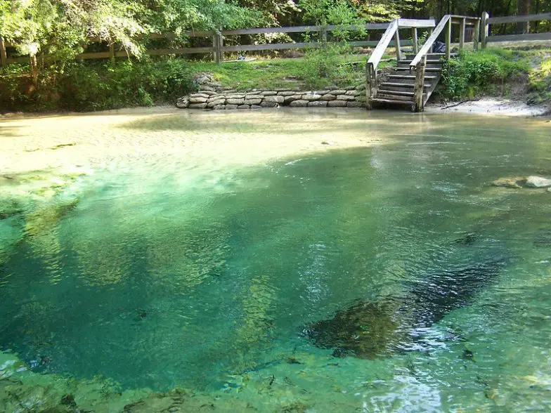 Royal Springs es una joya escondida y un parque natural de cinco acres en el condado de Suwannee. Este impresionante manantial cae 42 pies y cuenta con una plataforma emocionante para los valientes nadadores que quieren saltar a las resplandecientes aguas azul turquesa. Encontrarás una atractiva costa virgen con escaleras para acceder al agua, ya que este pozo natural para nadar en Florida es el lugar perfecto en el Estado del Sol para combatir el calor. También hay mesas de picnic y áreas verdes donde los niños pueden jugar.