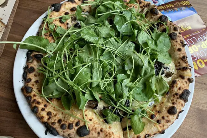 Continúe con la pizza Biancoverde, cuya corteza horneada en leña es la base perfecta para diferentes quesos derretidos y una deliciosa rúcula.
