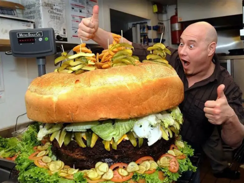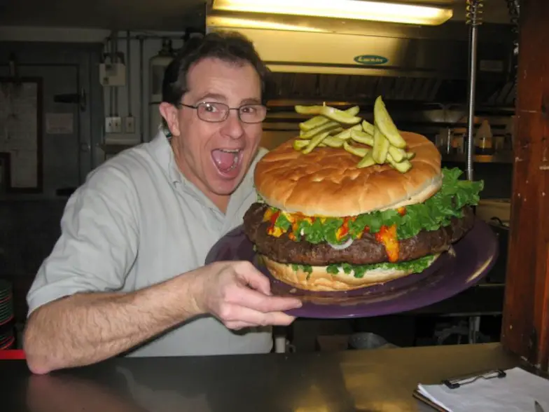 Kooky Canuck en Memphis, Tennessee, pagará su comida si termina la hamburguesa Kookamonga de más de 12,000 calorías en una hora. El bollo solo pesa 2 libras y la hamburguesa pesa cuatro libras. ¡Los condimentos solos agregan otras 1 1/2 libras! ¿Quieres papas fritas con eso? No hay problema.
