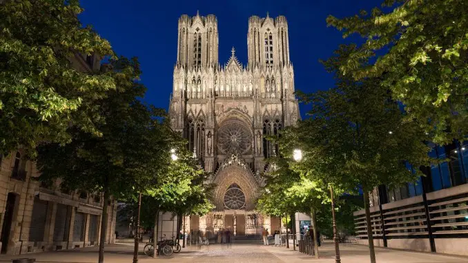 Con una longitud de 150 m (492 pies) y dos torres que se elevan 80 m (262 pies) sobre el suelo, la Catedral de Notre Dame de Reims es reconocida mundialmente como uno de los modelos definitorios del arte gótico. El monumental edificio da testimonio del notable dominio de las nuevas técnicas arquitectónicas adquiridas a lo largo del siglo XIII, y logra un armonioso matrimonio entre la arquitectura y la decoración escultórica. La perfección de la arquitectura y las esculturas de la catedral es tan grande que influyó en muchos edificios posteriores en todo el mundo. Esta obra maestra del arte gótico también desempeñó un papel importante en la historia de Francia durante 800 años, ya que fue el lugar de la coronación de los reyes franceses de Francia. ¡La catedral acogió treinta y tres coronaciones soberanas en poco más de 1000 años! Junto con la adyacente Abadía de San Remi y el Palacio Tau del siglo IX,
