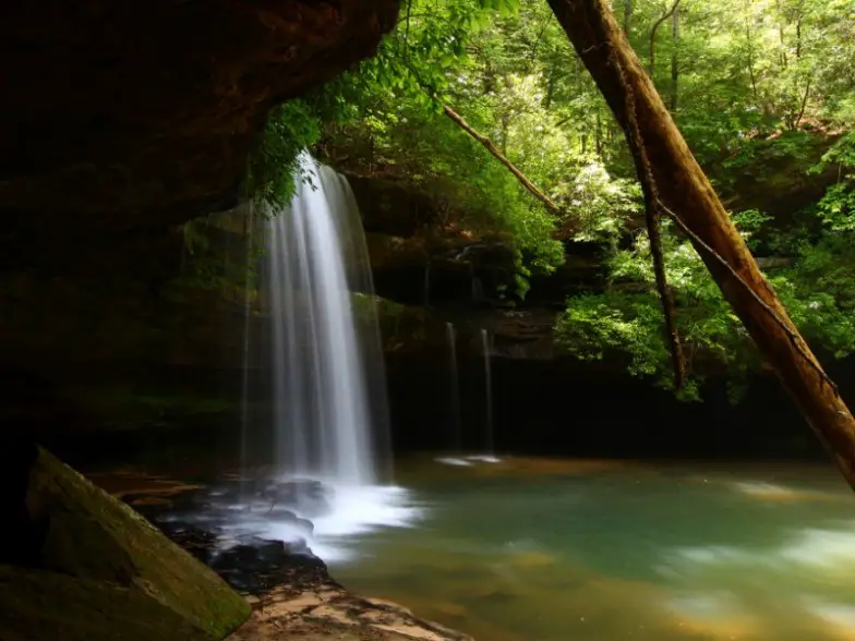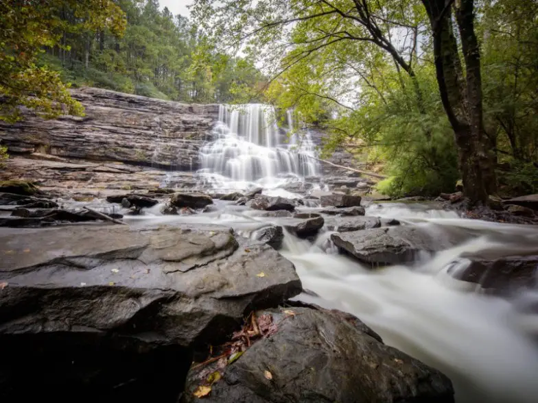 Esta cascada de tres niveles se encuentra en el Bosque Cheaha. Esta área de Alabama es verdaderamente un paraíso para los amantes de la naturaleza. Encontrado en el Bosque Nacional de Talladega, no solo encontrará esta impresionante cascada, sino también la montaña más alta de Alabama, el Monte Cheaha. Se requiere una caminata corta y agradable para llegar a las cataratas. Aquí encontrará un refugio de senderos para acampar o sitios para acampar para armar una tienda de campaña.