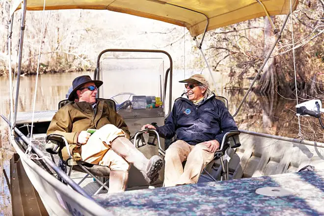 Las excursiones del delta de Jimbo implican navegar durante dos horas en un bote a través del delta de Mobile-Tensaw mientras es guiado por Jimbo, el guía experto.
