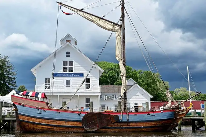 Aquí verá la réplica de 2009 del "Onrust" de 1614, uno de los primeros veleros construidos en el Nuevo Mundo y utilizado para navegar y escudriñar el río Connecticut y Long Island Sound.