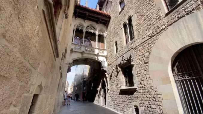 El centro de la Barcelona medieval, el actual Barrio Gótico ('Barri Gòtic'), sigue formando el núcleo de la Barcelona del siglo XXI. Su laberinto de calles estrechas y plazas está impregnado del pasado y el presente de la ciudad. Los puntos destacados del Barrio Gótico incluyen la sede del Gobierno catalán, la magnífica Catedral (con su claustro) y otras iglesias góticas, como Santa Maria del Pi y Sants Just i Pastor. Cerca de la Plaça de Sant Jaume se encuentra el antiguo barrio judío, el Call Jueu, con sus interminables callejuelas, donde aún se conservan algunos restos de la antigua sinagoga. El lugar más fotografiado del Barrio Gótico es el Puente del Obispo, que fue construido para la Exposición Internacional de Barcelona de 1929.