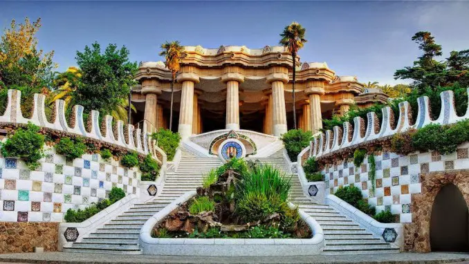 Ninguna obra de Gaudí resume mejor la perfecta armonía entre naturaleza y arquitectura que el Park Güell. Inicialmente diseñado como una ciudad jardín de estilo inglés, finalmente se convirtió en el parque público más inusual de Barcelona. El Park Güell fue un intento de crear una urbanización en un entorno natural en el antiguo pueblo de Gràcia: un ambicioso (pero fallido) proyecto de promoción inmobiliaria encargado por el mecenas de Gaudí, Eusebi Güell. La vívida imaginación característica de Gaudí se revela en los diferentes elementos que asombran a los visitantes de todo el mundo. La famosa escalinata del parque, con un dragón cubierto de piezas de cerámica rota de colores, conduce a una sala hipóstila, un impresionante espacio compuesto por 86 columnas. Encima de esta sala hay una plaza enorme, bordeada por un banco curvo, que ofrece unas vistas fenomenales de la ciudad.
