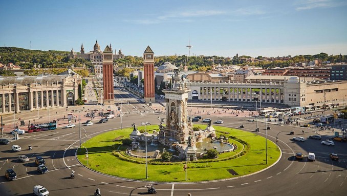 Las principales arterias de Barcelona convergen en la Plaça Espanya, la plaza más monumental de la ciudad. En 1929 se encargó a Josep Maria Puig i Cadafalch el diseño de la plaza de la Exposición Internacional. La plaza se convirtió en la puerta de entrada a la feria y el arquitecto Jujol diseñó la fuente ornamental del centro, rica en esculturas. A la entrada de la Avinguda Maria Cristina, dos altas torres, que son réplicas del campanario de San Marcos en Venecia, vigilan la plaza. La vista desde aquí es inmejorable: el Palau Nacional se recorta contra el cielo, con la Fuente Mágica debajo. Este es probablemente uno de los lugares más bonitos y espectaculares de Barcelona.