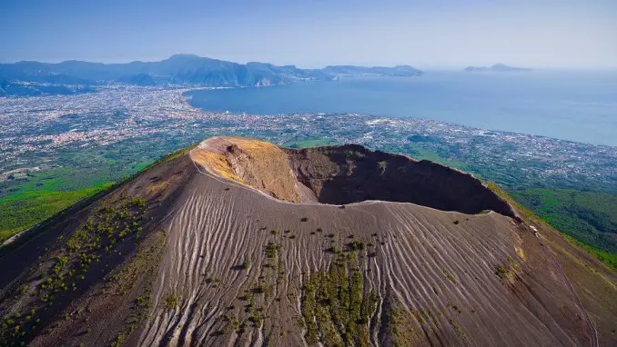 El Monte Vesubio es probablemente el volcán más conocido y también el más peligroso del mundo. La erupción del 79 d. C. dejó un gran cráter que creció y se encogió con las erupciones posteriores y todavía se puede visitar hoy. Es un volcán actualmente inactivo que ocasionalmente emite corrientes de lava (la última erupción fue en 1944), aunque su estado inactivo podría ser una indicación de una acumulación de presión y una próxima erupción explosiva. Los visitantes pueden caminar hasta la cima del volcán, que ofrece una vista del cráter que todavía humea ligeramente. Además de eso, la cima también ofrece un panorama impresionante que domina la Bahía de Nápoles, pero solo en días despejados (la montaña está notoriamente cubierta de niebla o nubes).