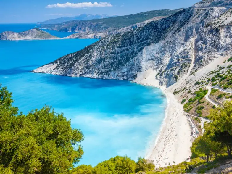 La playa de Myrtos en Cefalonia, la más grande y una de las islas Jónicas más hermosas, también se fotografía a menudo, con una vista desde arriba absolutamente impresionante. Estar en la playa en sí es mágico, contemplar el mar que cambia de azul eléctrico y turquesa a zafiro. Hay un pequeño bar y cerca hay varios restaurantes tradicionales griegos. El interior de la isla también es espectacular, con montañas esmeralda y un parque nacional centrado alrededor del monte Ainos cubierto de pinos, cipreses y olivos, un lugar donde deambulan caballos salvajes y ciervos.