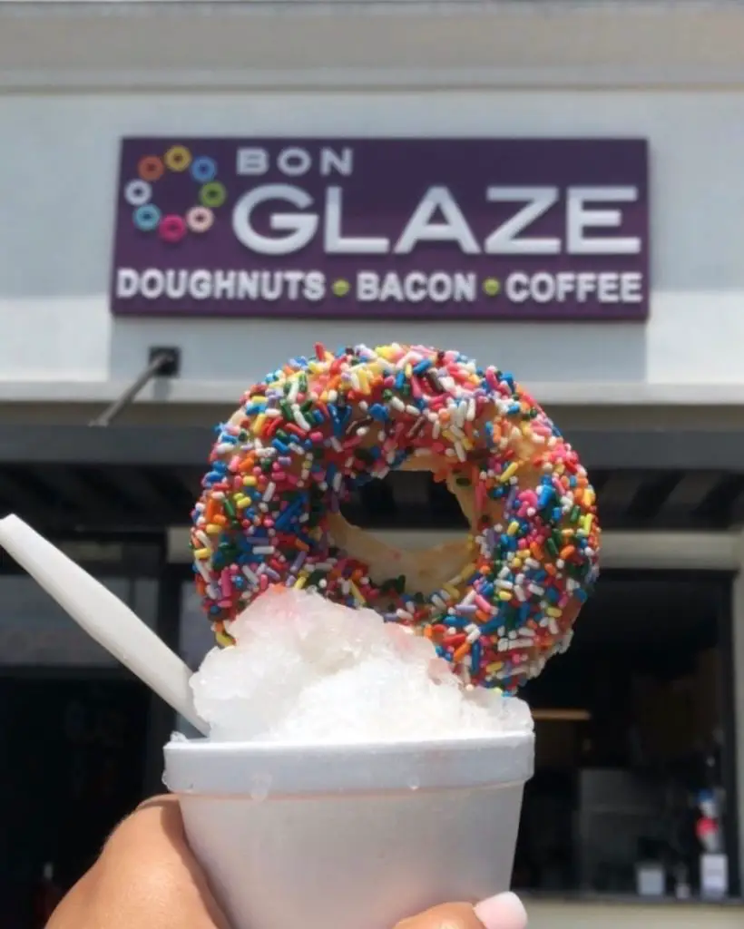 Hielo raspado con sabor a dona con una dona encima: pellizcarnos. Presentado en The Food Network por sus deliciosos anillos de bondad en una gran variedad de sabores lujosos, se está corriendo la voz en Atlanta de que este es el lugar para una delicia fresca. Bon Glaze es conocido por su versión divertida de los dulces, y este manjar helado puede ser el más increíble hasta el momento.
