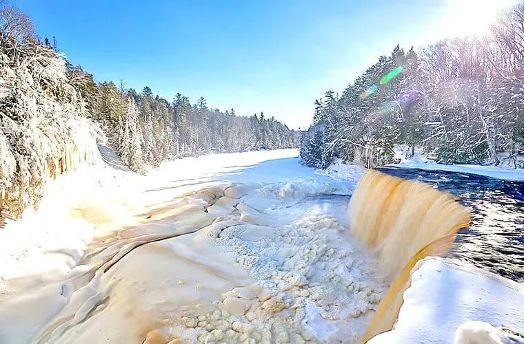 Lo más destacado del Parque Estatal Tahquamenon Falls en cualquier temporada son sus cascadas. El invierno brinda la oportunidad única de ver una tierra de fantasía congelada de sábanas brillantes y picos de hielo. Las cataratas superiores tienen 50 pies de alto y 200 pies de ancho.