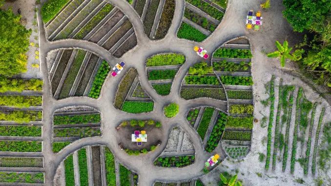 Al construir el fabuloso resort, Soneva mantuvo su impacto ambiental en las Maldivas lo más bajo posible. Las piscinas utilizan agua de mar con filtración UV y las villas se han construido sobre los suelos arenosos de la laguna, sin dañar ninguna parte del arrecife. Además, la energía solar fotovoltaica es una fuente importante de generación de energía en el complejo, todas las aguas residuales se recolectan y tratan en el lugar, y el agua también se produce en el lugar, incluida el agua potable. El “centro ecológico de conversión de residuos en riqueza” de Soneva garantiza que los residuos se reciclen, mientras que la extensa huerta del complejo (en la foto de abajo) ofrece productos locales para los restaurantes.
